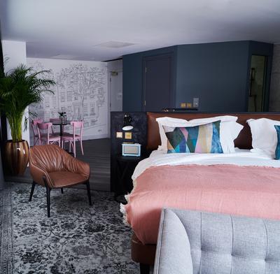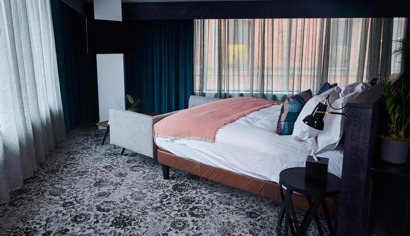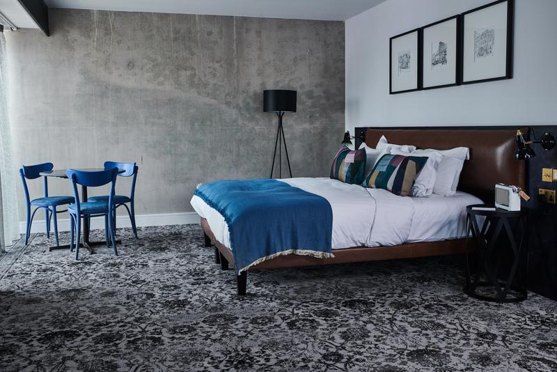 Guest-rooms feature a loft-inspired aesthetic with carefully curated furniture and exquisite finishing touches such as Turkish inspired carpets by Brintons which contrast beautifully with the concrete walls. Squid.inc wanted to create the look of a traditional Persian carpet that was like an old family heirloom handed down, slightly faded but still very elegant and homely. A quirky angled layout enforces the bold urban feel of the guest-rooms, providing guests with an insight into the vibrant city outside.