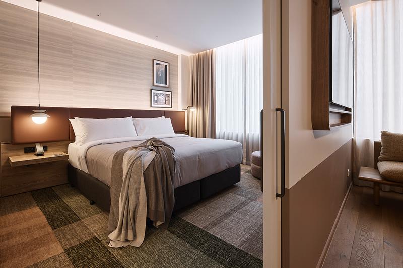 Brintons supplied over 3,000 square metres of custom Axminster carpet throughout the hotel. Designed to complement the project's natural material palette.