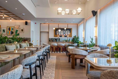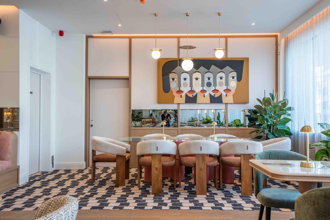 Brintons collaborated with Merav Bustan Design to develop two bespoke Axminster carpet designs for inset rugs in the hotel’s restaurant and meeting areas. Created specifically for the public spaces, the patterns respond to the softer, more fluid spatial language of these areas, reinforcing a welcoming, residential atmosphere while preserving the hotel’s overall sense of ingenuity. The carpets were designed to work in harmony with light, movement, and the architectural flow of the space.